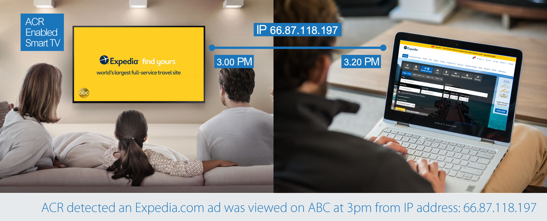 In the above example, we see a family with an ACR enabled Smart TV viewing an Expedia ad on ABC. Before the ad break, the ACR technology recognized the programming as being associated with ABC Network. TV commercials can also be fingerprinted in order for smart televisions to recognize them. In this example, an Expedia creative was detected at 3PM. Since Smart TV’s are connected devices, the household IP address is known. Any subsequent website visit from the same consumer household will share the same IP address allowing attribution companies to associate the website visit to a specific ad exposure.