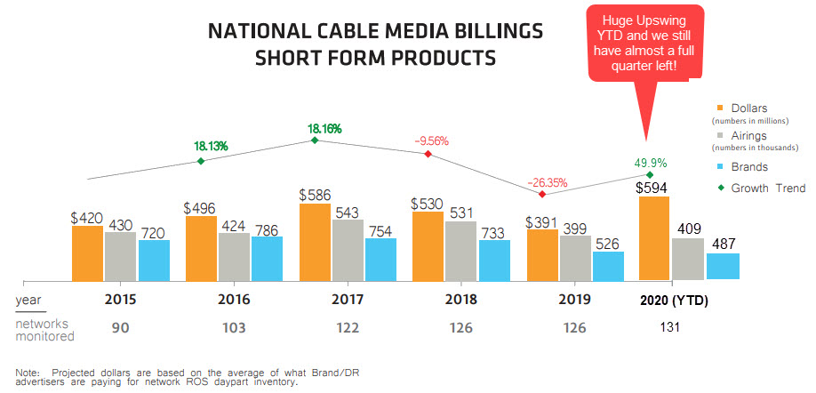 Despite the challenges of COVID-19, the industry has already set a new record for TV media expenditures and the year is far from over! The following chart shows short form product expenditures for the previous 5 years compared to 2020 YTD data.